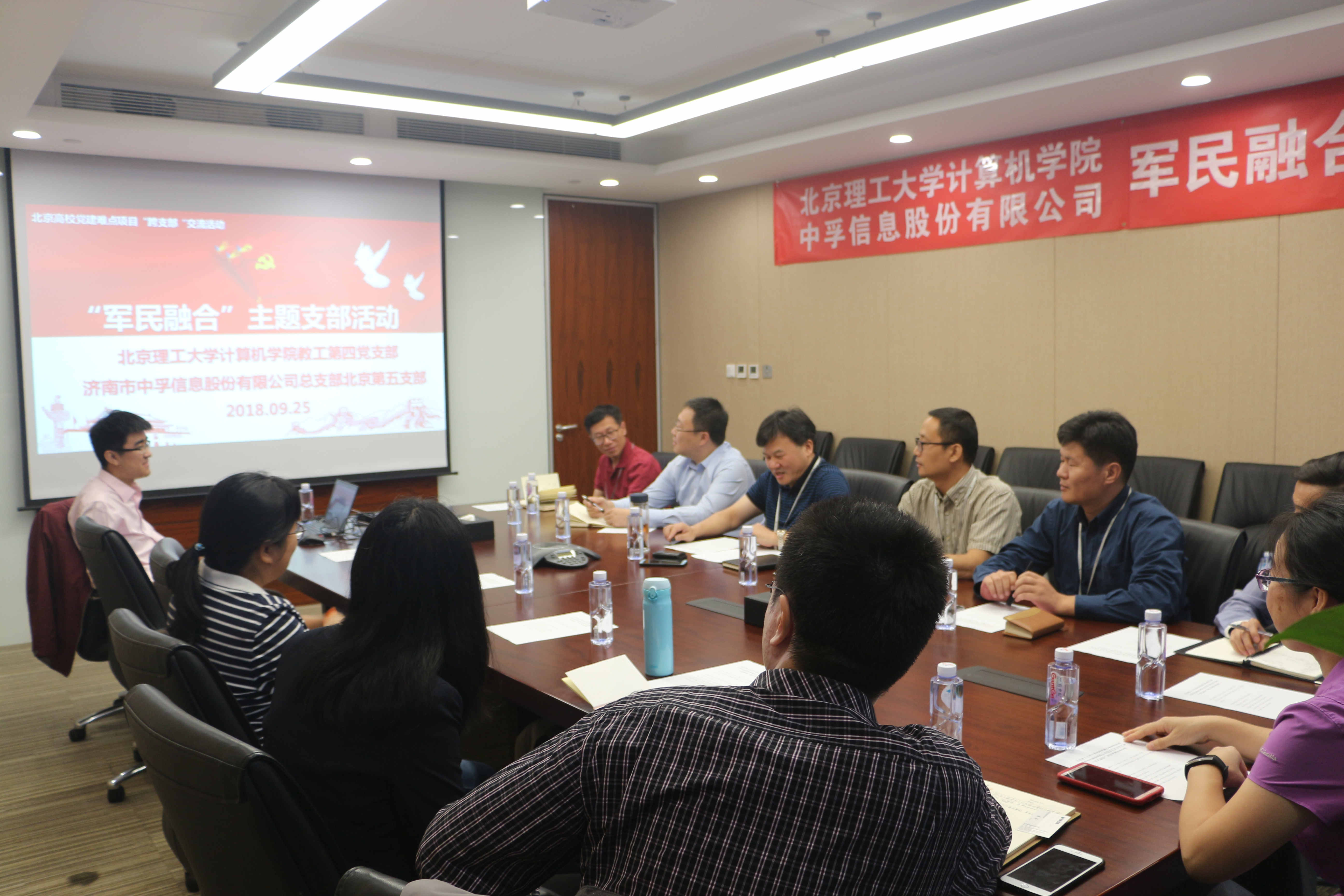 2018年9月25日上午,星空体育(中国)官方网站 - 登录入口第五党支部与北京理工大学计算机学院教工第四党支部,以“军民融合”为主题,进行首次联合党建交流活动。北京理工大学计算机学院教工第四党支部书记祝烈煌、星空体育党总支书记张太祥以及双方部分党员同志参加了活动。