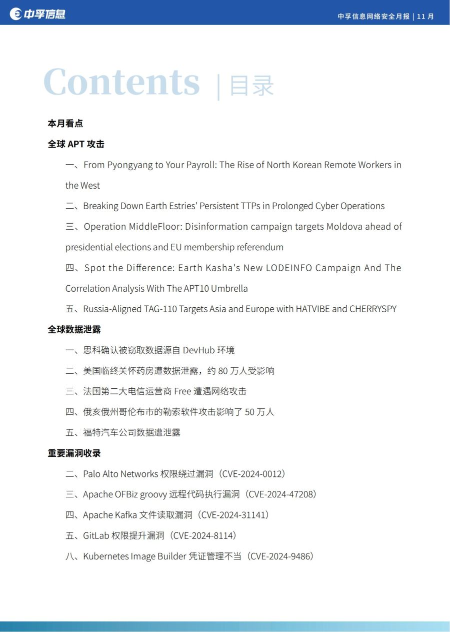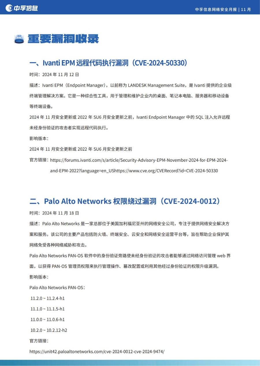 在本月收录的安全漏洞里,影响较大且值得关注的是:Ivanti EPM 远程代码执行漏洞(CVE-2024-50330);Palo Alto Networks 权限绕过漏洞(CVE-2024-0012);Apache OFBiz groovy 远程代码执行漏洞(CVE-2024-47208);Apache Kafka 文件读取漏洞(CVE-2024-31141)等。