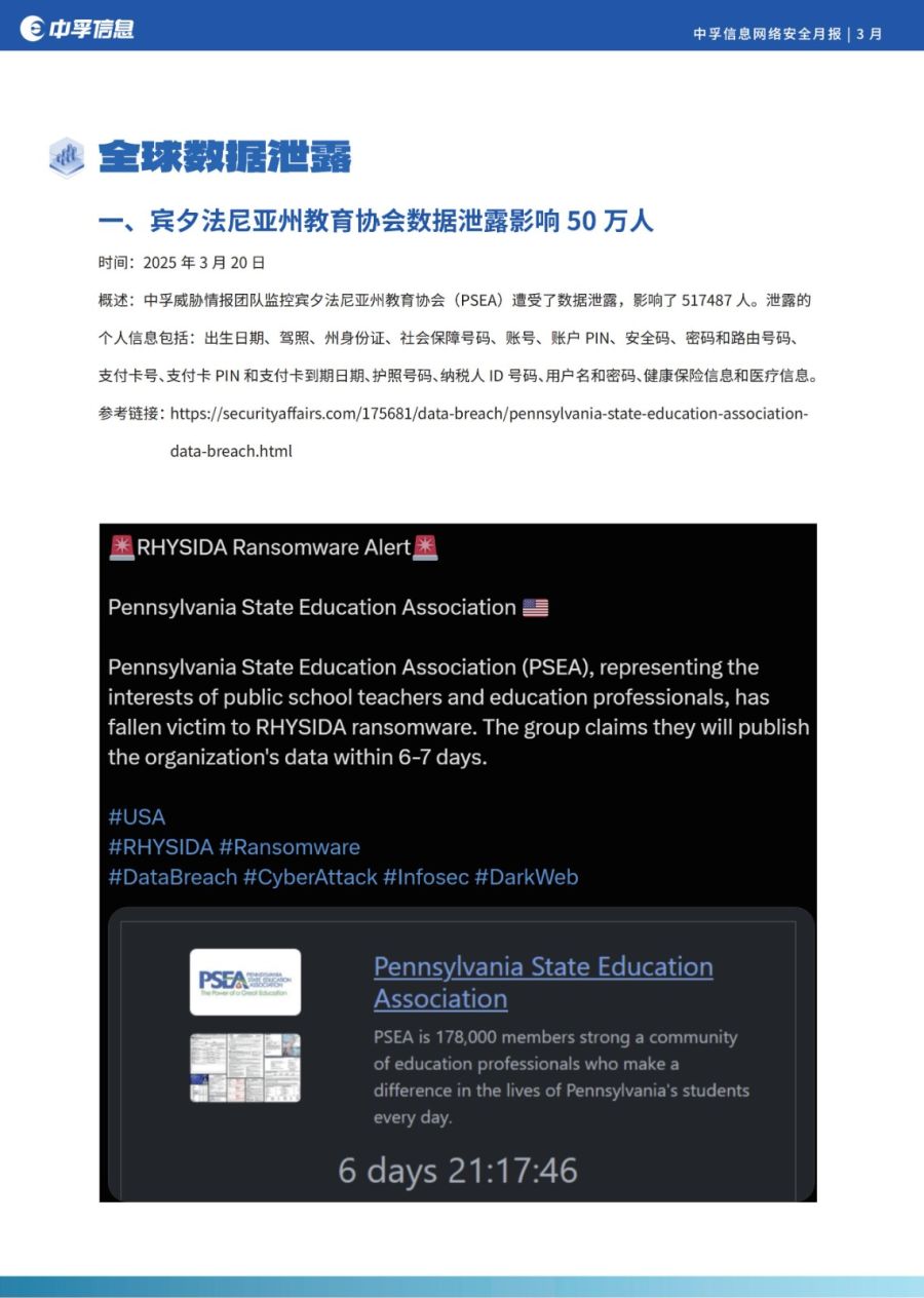 此外,互联网行业数据泄露严重,其中个人隐私仍是热点,其中有:美国加州冷冻库揭露一起数据泄露事件;勒索集团声称已入侵塔塔技术公司并窃取1.4TB数据;宾夕法尼亚州教育协会数据泄露影响50万人;日本电信巨头NTT遭遇数据泄露等。